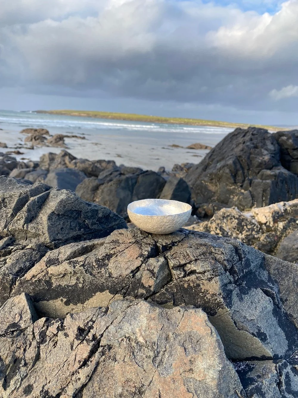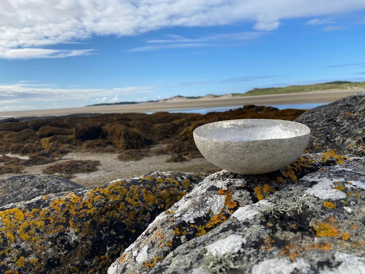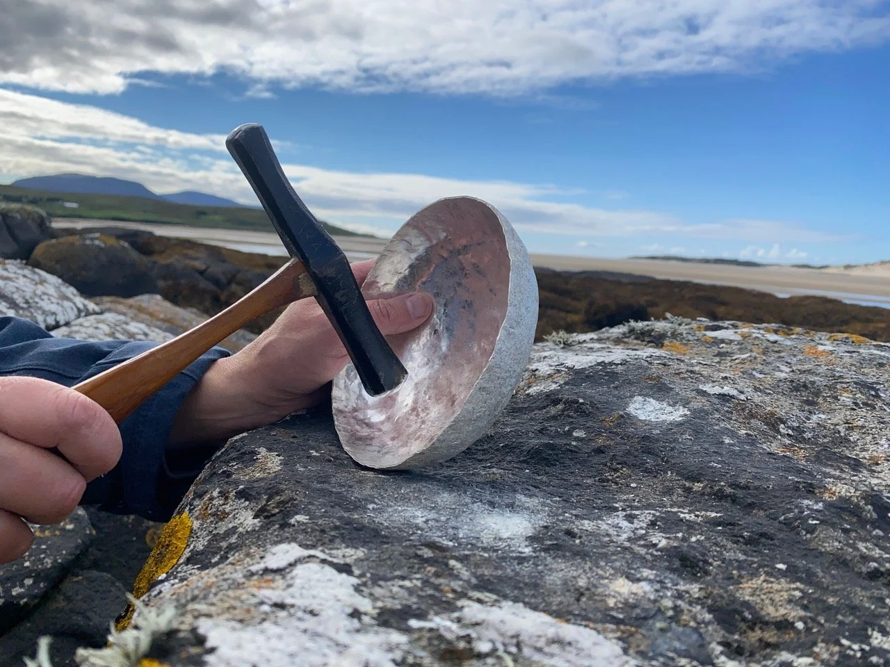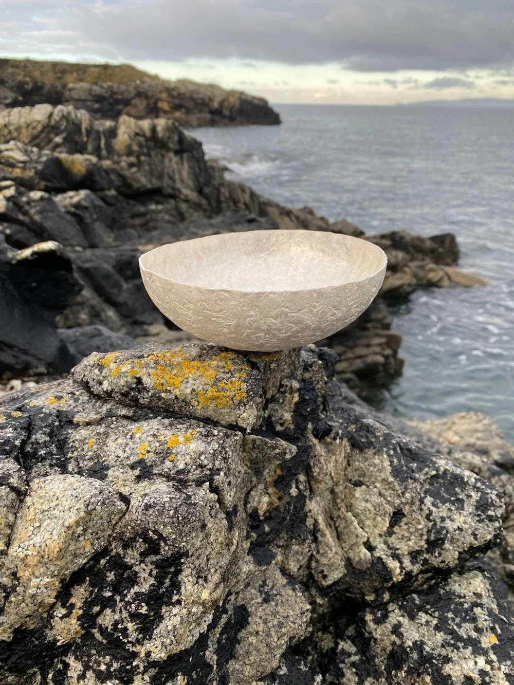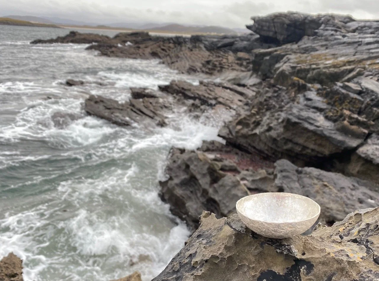As a silversmith I predominantly hammer over steel forms to create my work, but as my work is influenced by the Irish environment I sometimes bring stone into the workshop and hammer into the hollows or round the stone. With the Royal Dublin Society Irish Craft Bursary I took my hammers outside and explored working directly in the natural rugged landscape. I wanted to challenge my making and see what happens when I hammer fine silver sheet into rocks at the beach. I wanted to explore potential forms created at the intersection of where the Atlantic Ocean meets the Irish coastline.