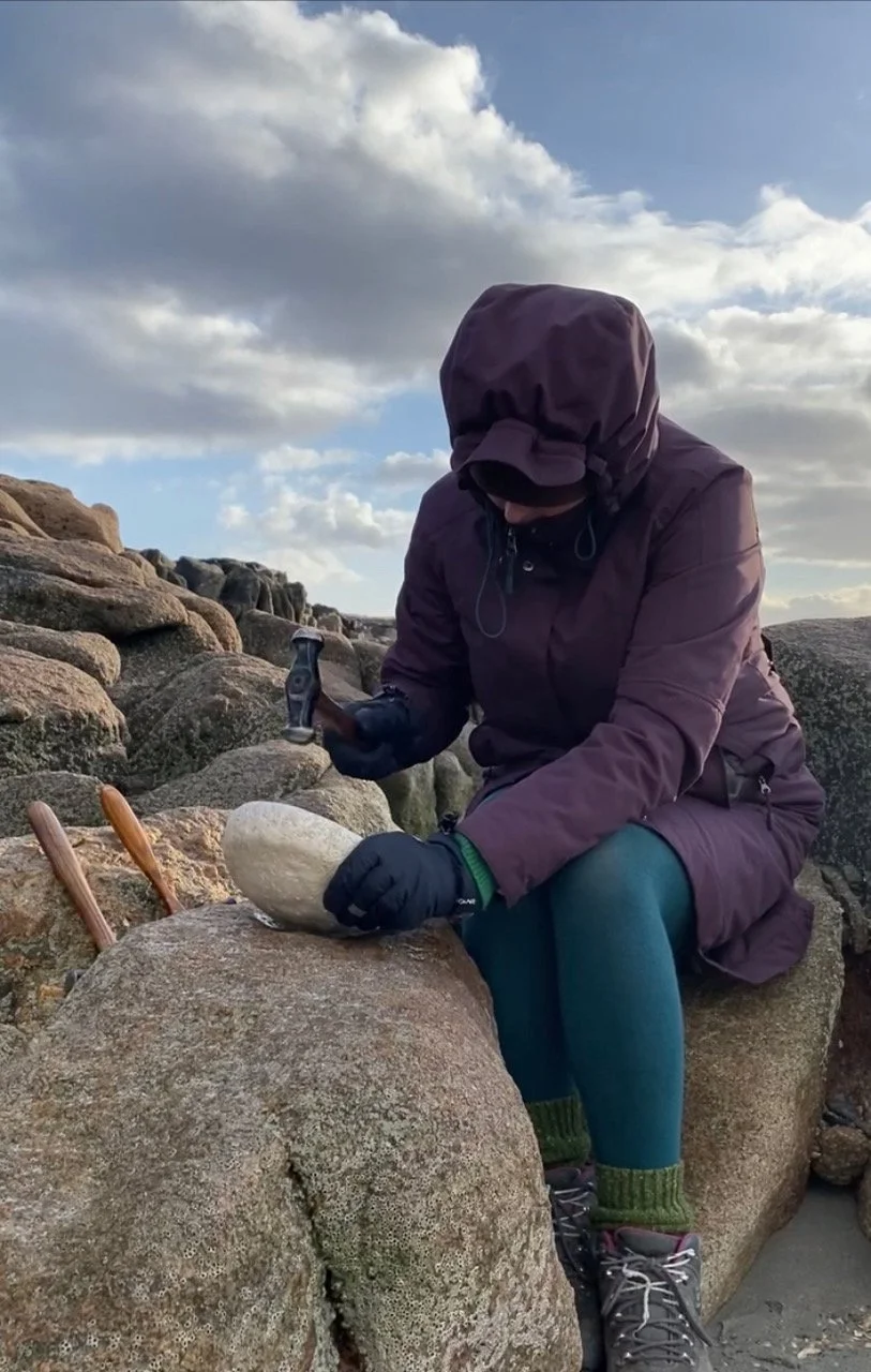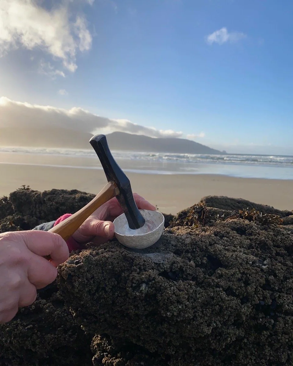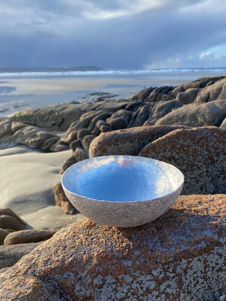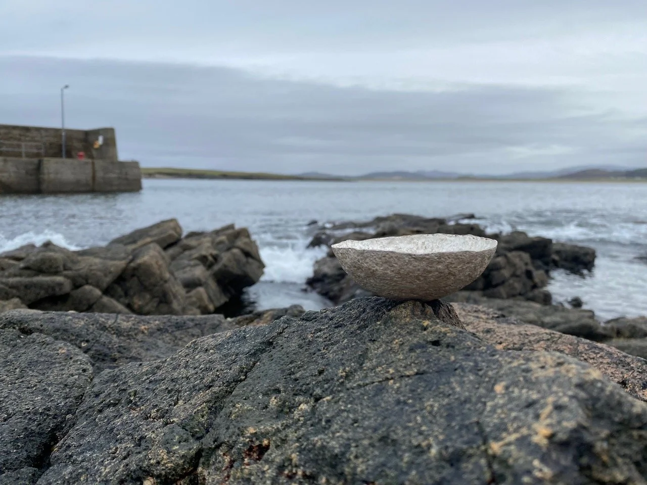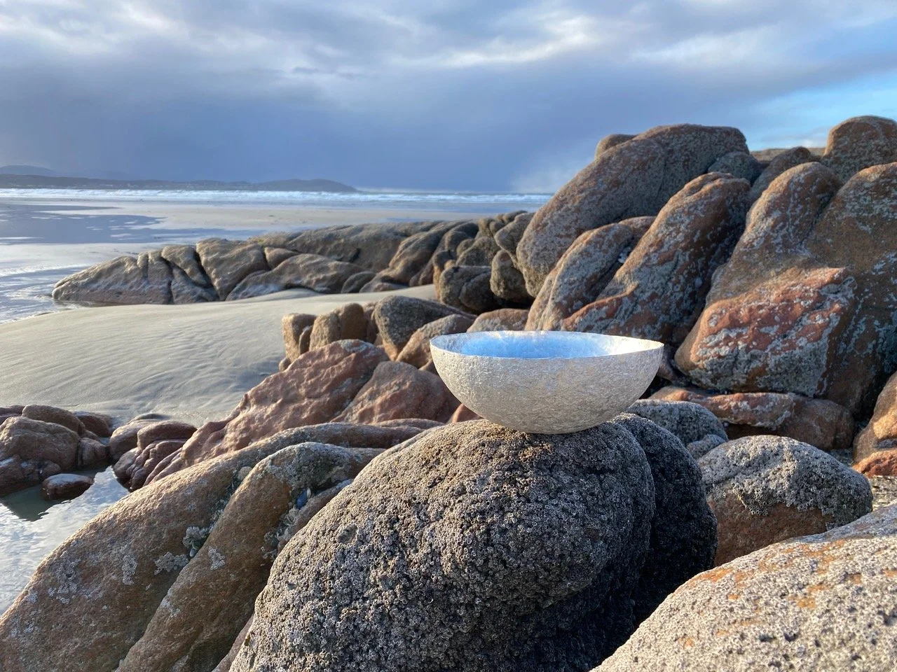 As a silversmith I predominantly hammer over steel forms to create my work, but as my work is influenced by the Irish environment I sometimes bring stone into the workshop and hammer into the hollows or round the stone. With the Royal Dublin Society Irish Craft Bursary I took my hammers outside and explored working directly in the natural rugged landscape. I wanted to challenge my making and see what happens when I hammer fine silver sheet into rocks at the beach. I wanted to explore potential forms created at the intersection of where the Atlantic Ocean meets the Irish coastline.