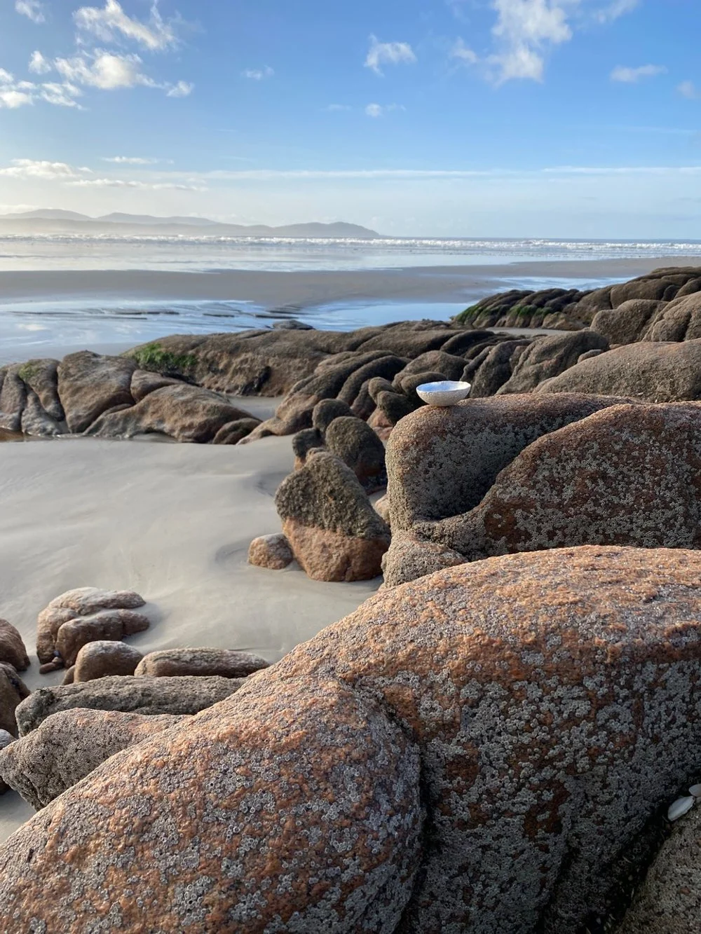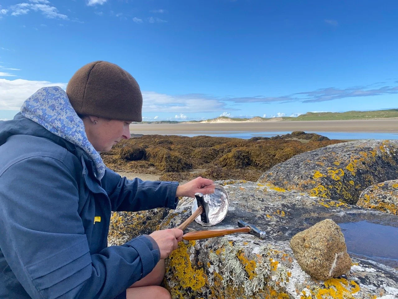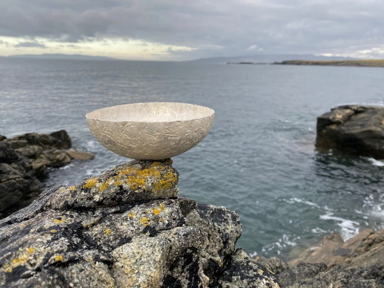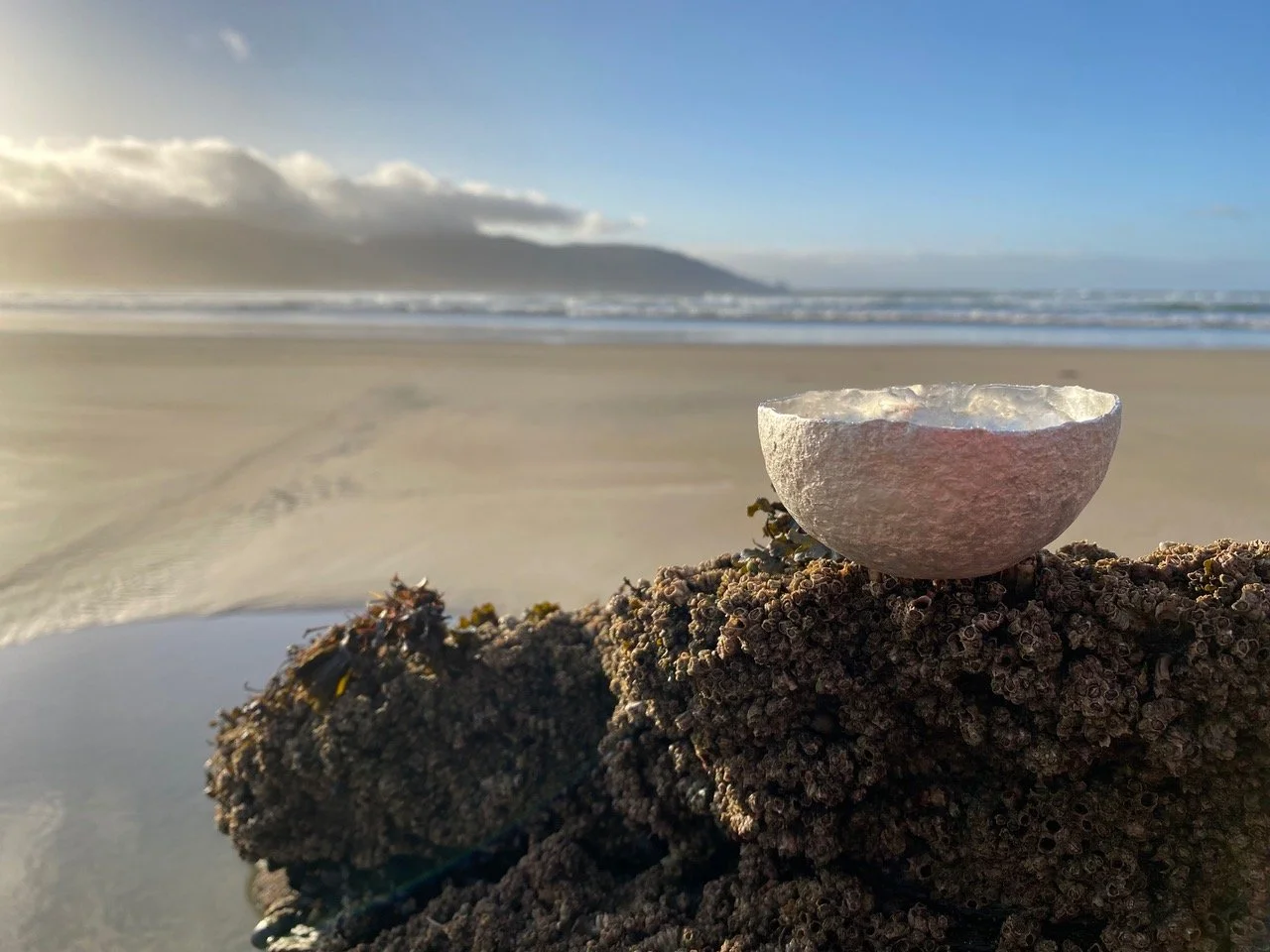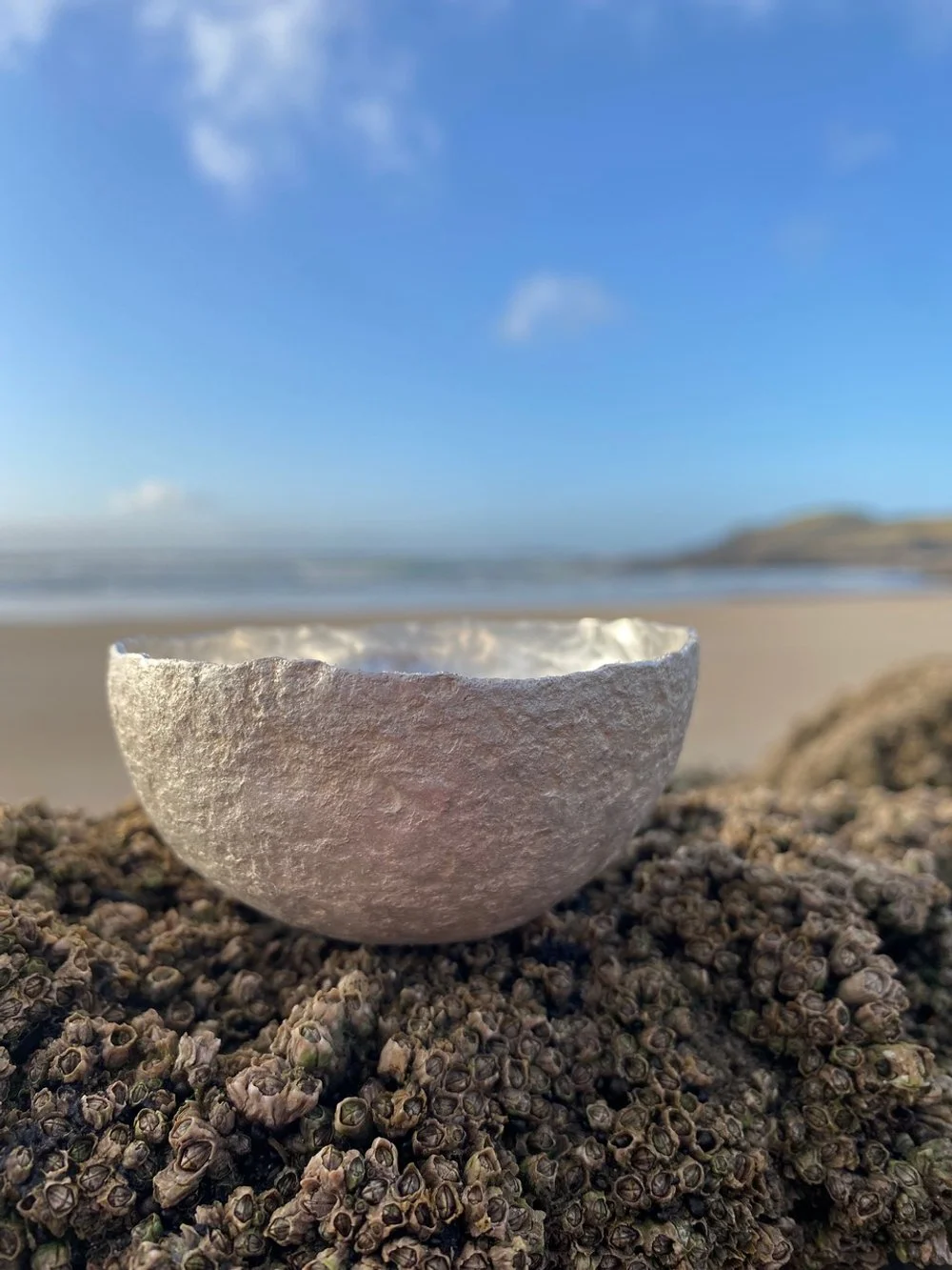 As a silversmith I predominantly hammer over steel forms to create my work, but as my work is influenced by the Irish environment I sometimes bring stone into the workshop and hammer into the hollows or round the stone. With the Royal Dublin Society Irish Craft Bursary I took my hammers outside and explored working directly in the natural rugged landscape. I wanted to challenge my making and see what happens when I hammer fine silver sheet into rocks at the beach. I wanted to explore potential forms created at the intersection of where the Atlantic Ocean meets the Irish coastline.